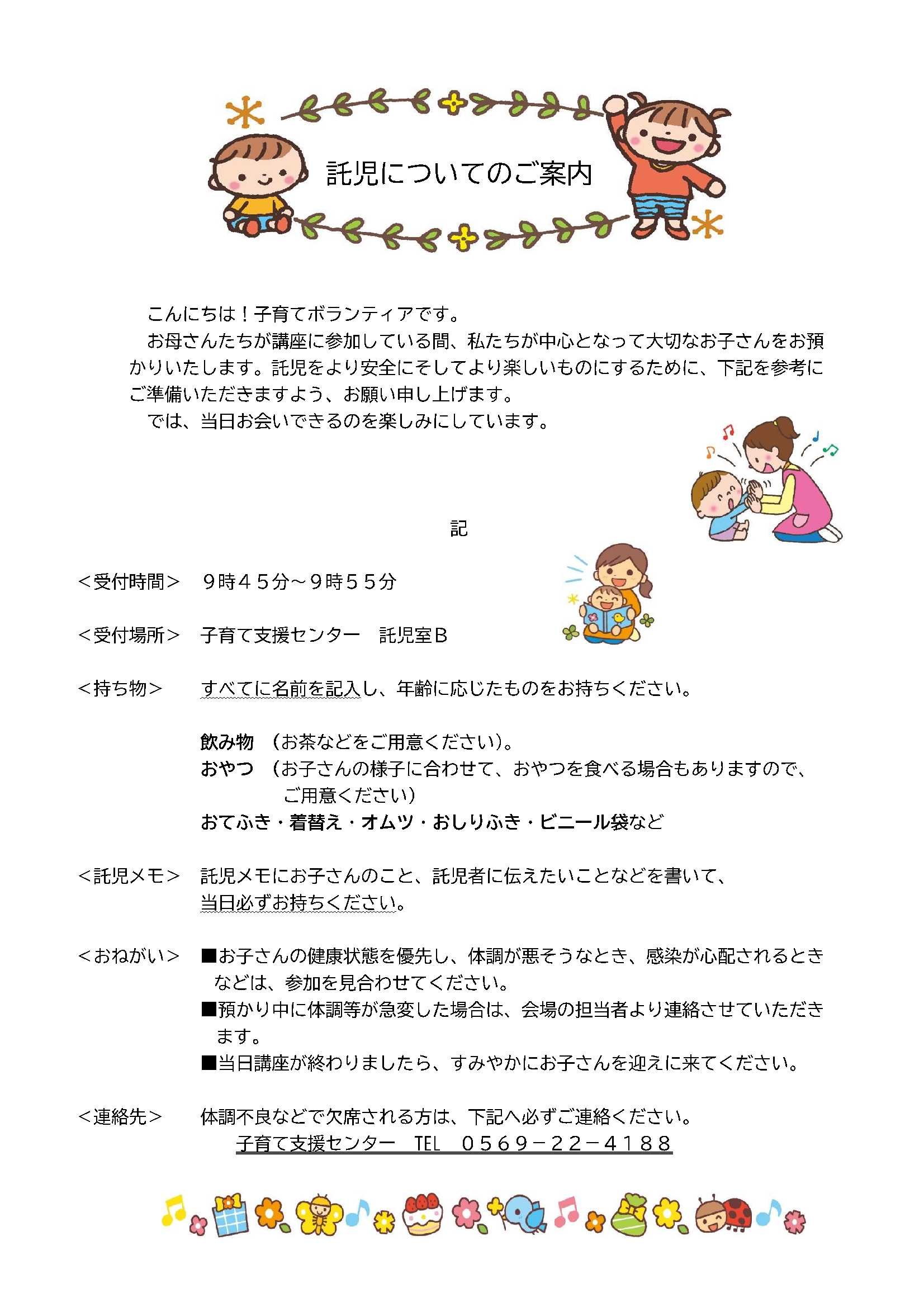 負担有り(託児を希望される場合は、子ども1人につき500円託児あり ※託児をご利用される方は、事前に「託児メモ」を子育て支援センターに取りに来ていただくか、 添付ファイルをダウンロード(印刷)していただき、ご記入の上、当日、忘れずにお持ちください。 ※講座お申し込み時に、①子育て支援センターに取りに来る ②ご自身でダウンロードする をお知らせください。)